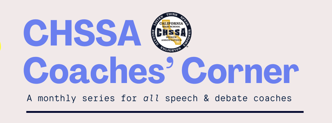 This banner promotes the CHSSA Coaches’ Corner, a monthly series of free virtual events for speech and debate coaches. The design features a gold state champion trophy on the left, the CHSSA logo in the center, and bold text that reads ‘CHSSA Coaches’ Corner: A monthly series for all speech & debate coaches.’ The style is clean, bright, and welcoming.